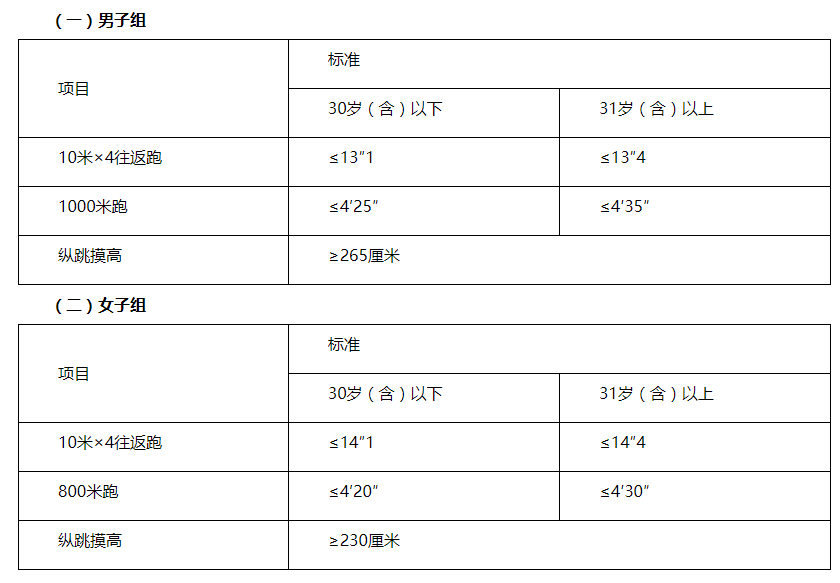 體能測(cè)評(píng)三項(xiàng)全部達(dá)標(biāo)方為合格。報(bào)考理化檢驗(yàn)、獄醫(yī)緊缺職位的人員,體能測(cè)評(píng)三項(xiàng)中有兩項(xiàng)達(dá)標(biāo)的,視為合格。
