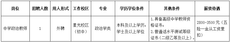 南寧市第十中學(xué)創(chuàng)立于1958年,是廣西壯族自治區(qū)示范性普通高中,南寧市普通高中常規(guī)管理優(yōu)秀學(xué)校。學(xué)校黨委堅守立德樹人的根本任務(wù),堅持以教書育人為本的教育理念,為黨育人、為國育才,引領(lǐng)十中全體師生,戮力同心,奮楫篤行。學(xué)校實行黨組織領(lǐng)導(dǎo)的校長負責(zé)制,經(jīng)過60多年的艱苦奮斗,教育教學(xué)質(zhì)量穩(wěn)步上升,先后獲“自治區(qū)文明校園”“自治區(qū)衛(wèi)生學(xué)校”“南寧市先進基層黨組織”“南寧市依法治校示范校”“南寧市‘十三五’教育科研先進單位”“南寧市高中畢業(yè)班工作卓越獎”“特長生培養(yǎng)優(yōu)秀獎”等榮譽,并連續(xù)多年獲得“南寧市高中畢業(yè)班工作優(yōu)秀獎”。學(xué)校校園環(huán)境優(yōu)美、教學(xué)設(shè)施齊全、辦學(xué)理念先進、辦學(xué)質(zhì)量蒸蒸日上,既具有豐厚的文化歷史底蘊、又充滿青春活力。學(xué)??傉嫉?93.4畝,目前有兩個校區(qū)。其中星光校區(qū)為初中部,地處南寧市江南區(qū)星光大道西二里10號,占地面積21417平方米;上津校區(qū)為高中部,地處南寧市江南區(qū)上津路26號,占地面積86843.64平方米,是全寄宿制高中。學(xué)校擁有高配置的理化生實驗室、多媒體教室、移動教室、錄播教室、心理輔導(dǎo)室、舞蹈室、室內(nèi)體育館、標準運動場,學(xué)校圖書館的藏書量達12萬冊。上津校區(qū)實現(xiàn)了“智慧校園”全覆蓋,學(xué)生的考勤、圖書借閱、就餐等校園生活全部實現(xiàn)了一卡通智慧管理。優(yōu)越的學(xué)習(xí)環(huán)境為懷揣夢想的十中學(xué)子搭建了高起點、高標準的學(xué)習(xí)平臺。在“養(yǎng)正毓德,璞玉生輝”辦學(xué)理念和“潤石成玉”學(xué)校文化主題的引領(lǐng)下,學(xué)校以“提升初中,辦強高中”為辦學(xué)目標,恪守“勇于超越,成就自我”的校訓(xùn),以“潤毓品德高尚,勇于追求夢想,擁有家鄉(xiāng)情懷的如玉君子”作為育人目標,進一步凸顯學(xué)校的五大特色(“潤實”黨建特色、“潤心”管理特色、“一班一品”德育特色、“信•實”課堂特色、“潤玉”課程特色),全面抓實學(xué)校科學(xué)化、精細化、人文化管理。先進的辦學(xué)理念、特色化的辦學(xué)路徑為學(xué)校今后實現(xiàn)宏圖大志注入了強勁的動力。根據(jù)學(xué)校工作需要,南寧市第十中學(xué)星光校區(qū)(初中部)面向社會招聘教職工,具體崗位如下: