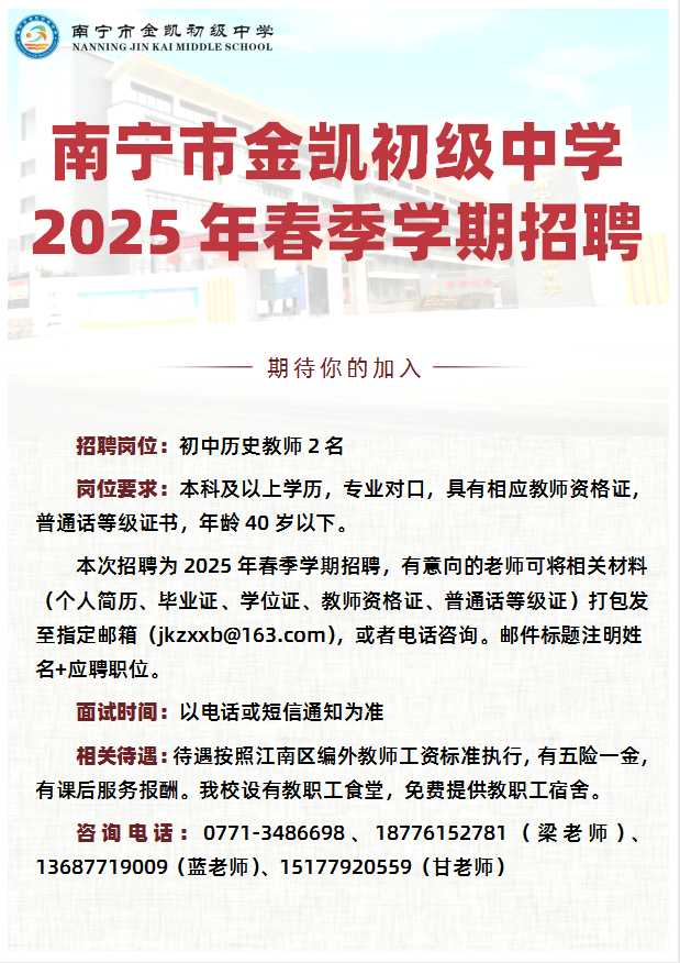 原文標題:南寧市金凱初級中學2025年春季學期招聘