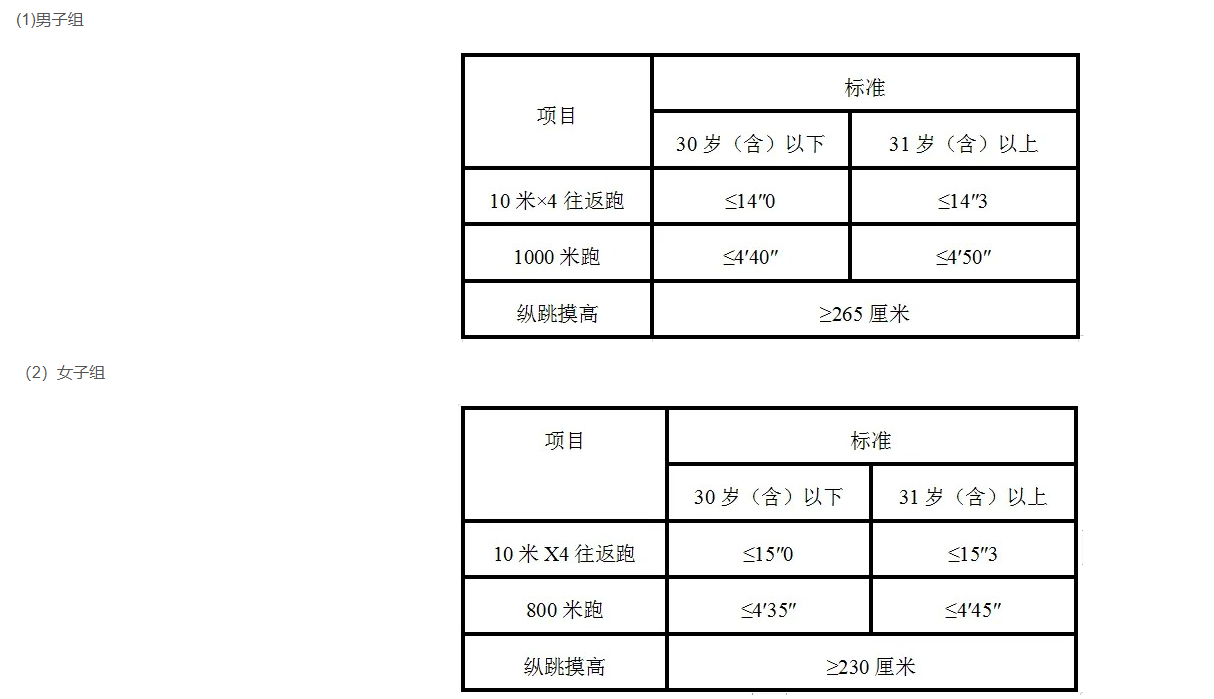3.參照《關(guān)于印發(fā)公安機(jī)關(guān)錄用人民警察體能測評項目和標(biāo)準(zhǔn)(暫行)的通知》(人社部發(fā)〔2011〕48號)的項目及測試規(guī)則,結(jié)合《公安民警體育鍛煉達(dá)標(biāo)手冊》成績標(biāo)準(zhǔn),體能測評的項目和標(biāo)準(zhǔn)如下: