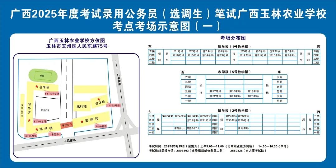 請(qǐng)及時(shí)登錄“廣西人事考試網(wǎng)”打印筆試準(zhǔn)考證并妥善保管,仔細(xì)查看準(zhǔn)考證上的考點(diǎn)信息。本次考試玉林市考區(qū)共設(shè)11個(gè)考點(diǎn),各考點(diǎn)名稱及地址如下: