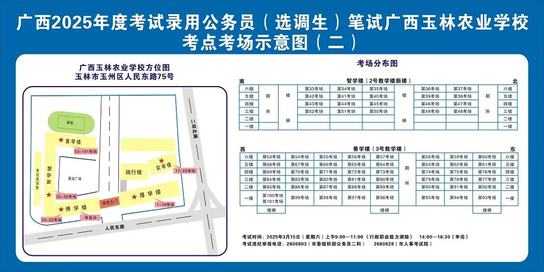 請(qǐng)?zhí)崆傲私獗救怂诳键c(diǎn)具體位置,熟悉考點(diǎn)周邊情況,特別是考點(diǎn)周邊的食宿、交通情況,合理做好食宿安排和出行計(jì)劃。需要特別注意的是:玉林市第一職業(yè)中等專業(yè)學(xué)校考點(diǎn)是設(shè)在該校的東校區(qū)(人民東路東235號(hào));玉林市第一中學(xué)考點(diǎn)是設(shè)在該校的運(yùn)嶺路校區(qū)(二環(huán)北路1228號(hào))!