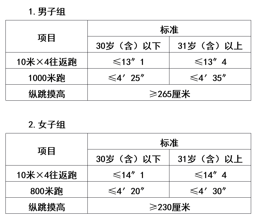 年齡計(jì)算時(shí)間截止到參加體能測(cè)評(píng)當(dāng)月。縱跳摸高項(xiàng)目的測(cè)評(píng)次數(shù)不超過3次,10米×4往返跑項(xiàng)目的測(cè)評(píng)次數(shù)不超過2次,男子1000米跑、女子800米跑項(xiàng)目的測(cè)評(píng)次數(shù)均為1次。