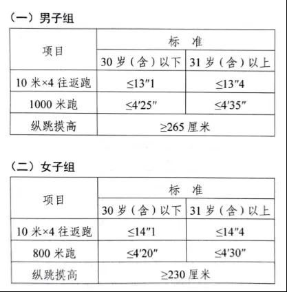 參照《公安機關(guān)錄用人民警察體能測評項目和標準》的項目及測試規(guī)則開展體能測評,本次體能測評的項目和標準如下: