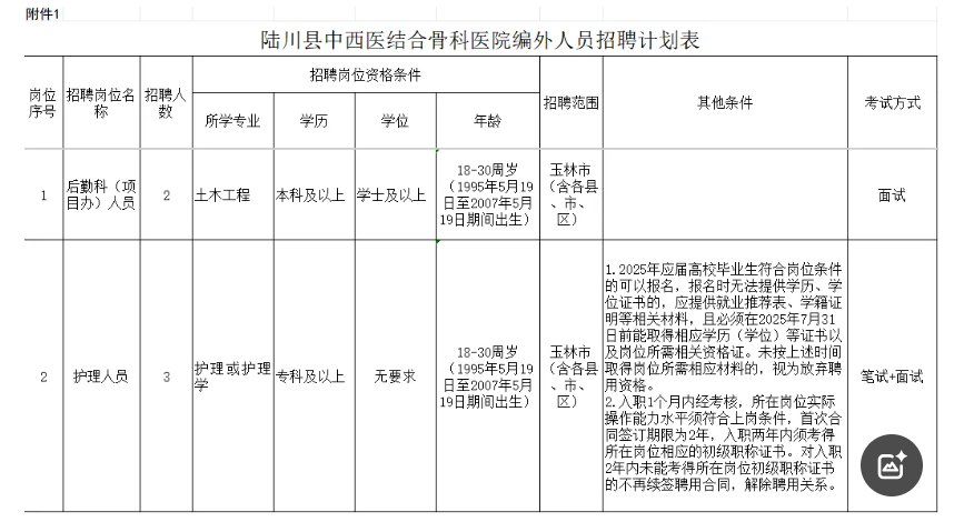 具體相關專業(yè)崗位條件詳見《陸川縣中西醫(yī)結(jié)合骨科醫(yī)院編外人員招聘計劃表》(附件1)。