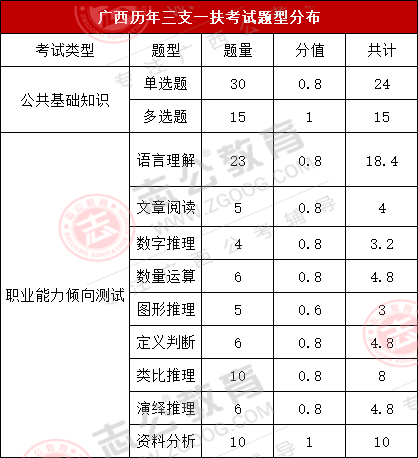上篇我們寫到,三支一扶的待遇,在廣西這個待遇還算不錯,政策上的支持也非常好,那么預(yù)計這個月月底出公告的三支一扶,啥時候筆試呢?2024年廣西三支一扶筆試時間是7月13日,其筆試科目為《綜合知識》一科,滿分100分。基于往年考生的回憶,綜合知識內(nèi)容主要包括公共基礎(chǔ)知識和行測職業(yè)能力測試兩個科目,而各題型的題量及分值如下圖所示: