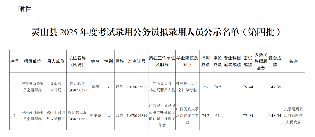 12 欽州市2025年度考試錄用公務(wù)員擬錄用人員公示(四)
