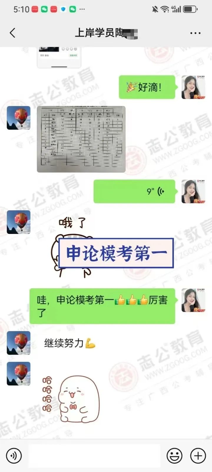 在備考的日子里,無(wú)數(shù)個(gè)夜晚,我看到他朋友圈發(fā)的經(jīng)常學(xué)習(xí)練習(xí)到教室關(guān)門(mén)最后一個(gè)才回家,無(wú)數(shù)次往返南寧和桂林兩座城市,只為家庭和研究生學(xué)業(yè)和公務(wù)員備考的有序進(jìn)行,讓我印象最深的一次,就是他微信拍了一張正在打針輸液的照片發(fā)給我,還打趣的跟我說(shuō):還好不影響我單手刷題! 即使學(xué)員因?yàn)樯眢w過(guò)于勞累導(dǎo)致生病在吊針,也絲毫沒(méi)有懈怠過(guò)學(xué)習(xí),讓我非常的佩服和感動(dòng)。