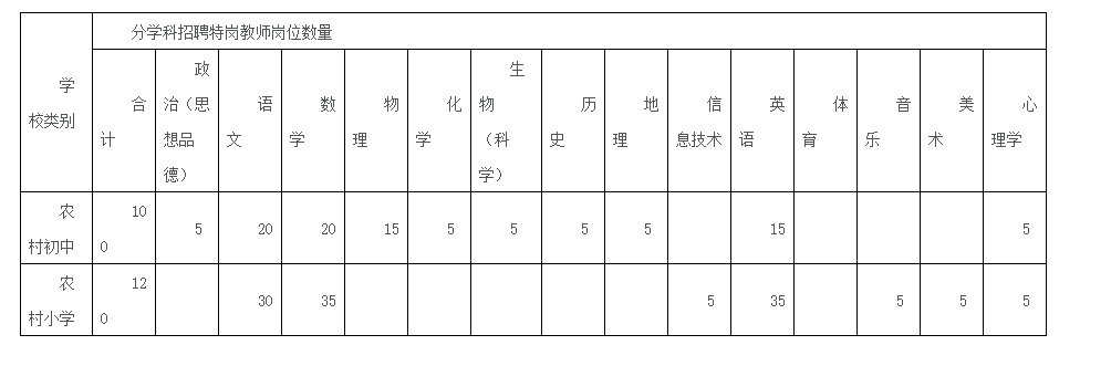 計劃招聘特崗教師220名,其中:小學(xué)120名,初中100名。具體崗位計劃如下表。