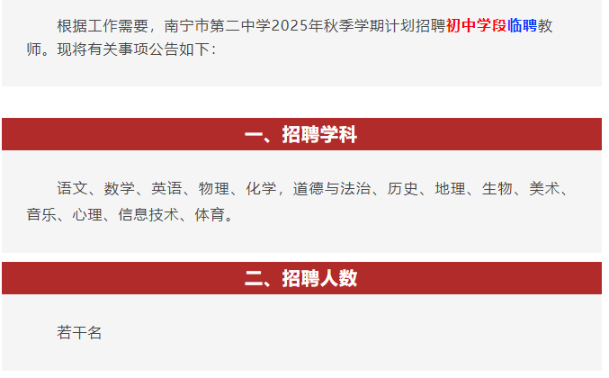 南寧市第二中學(xué)新民校區(qū)2025年臨聘教師招聘公告