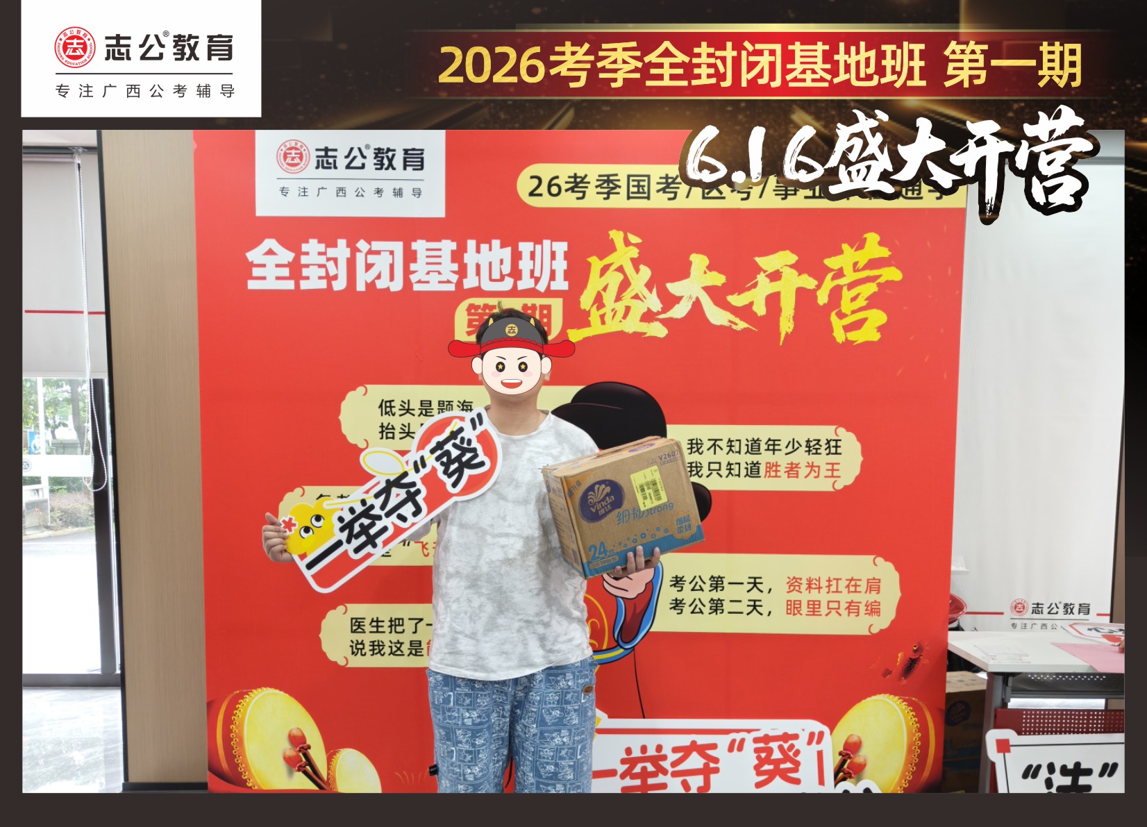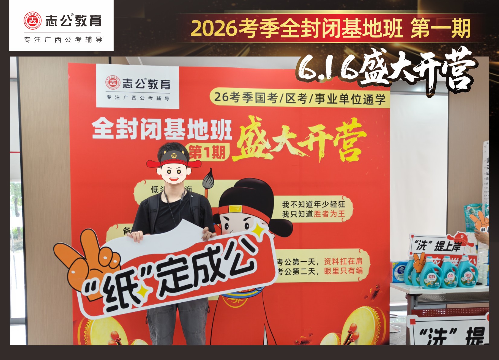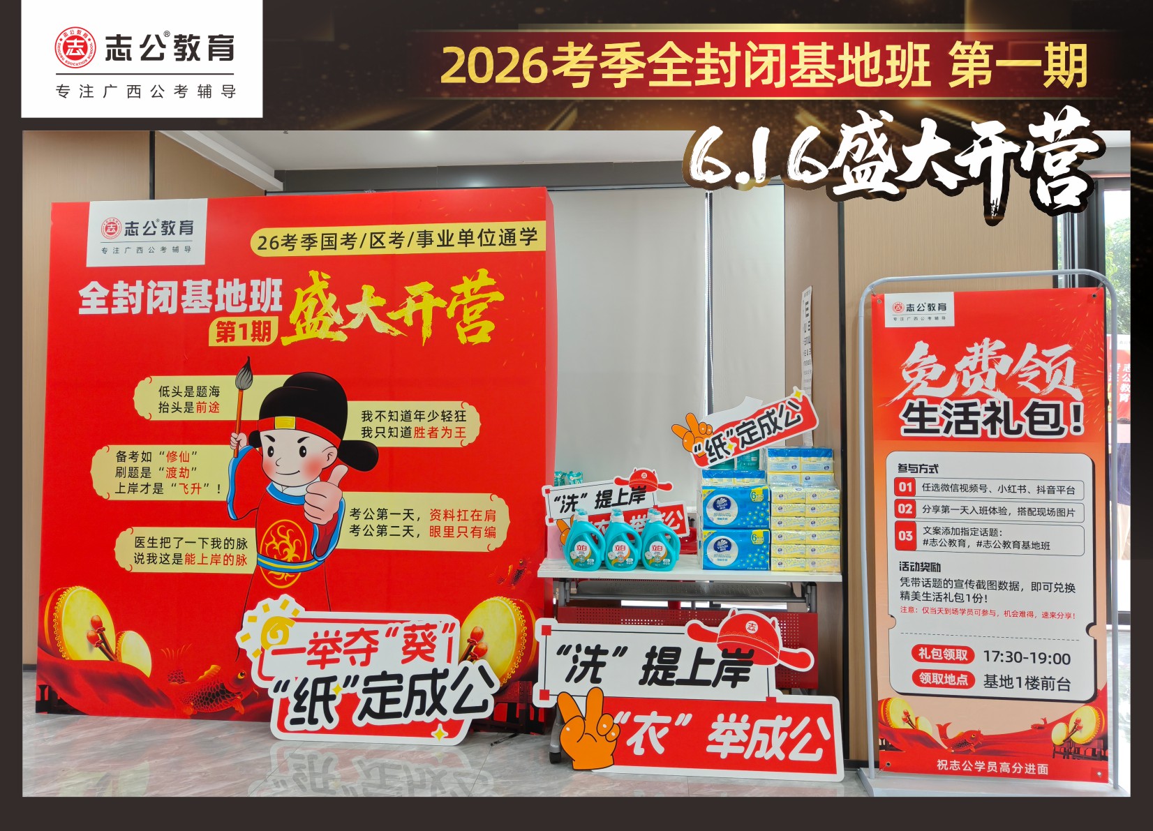 今天的開(kāi)班還有一系列小活動(dòng)噢~瞧!——“學(xué)員打卡活動(dòng)”,所有今天到場(chǎng)的基地班學(xué)員,通過(guò)做一些小任務(wù)的方式,可以到前臺(tái)領(lǐng)取生活禮包即可領(lǐng)取生活禮品1份(一提六包的紙巾,或者一瓶洗衣液),這也是志公教育對(duì)所有學(xué)員的美好祝愿,預(yù)祝大家未來(lái)能夠“紙”定成公,“洗”提上/岸,“衣舉成公”!