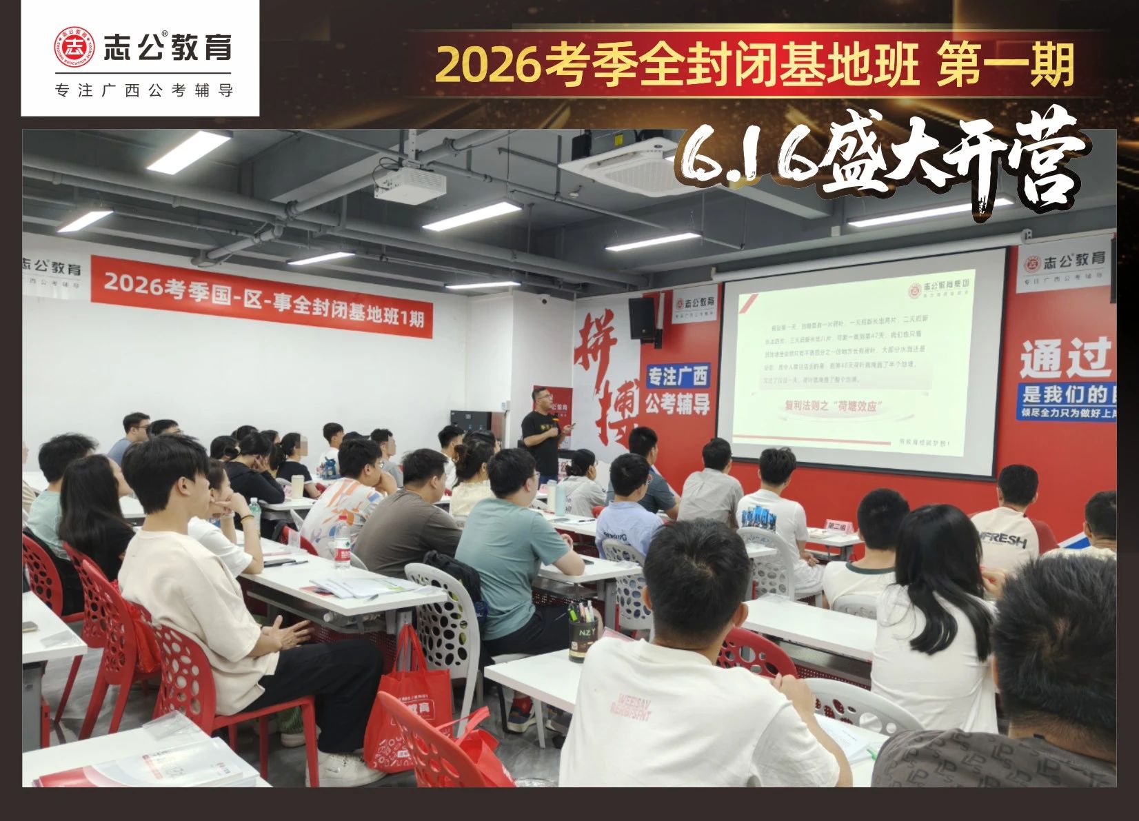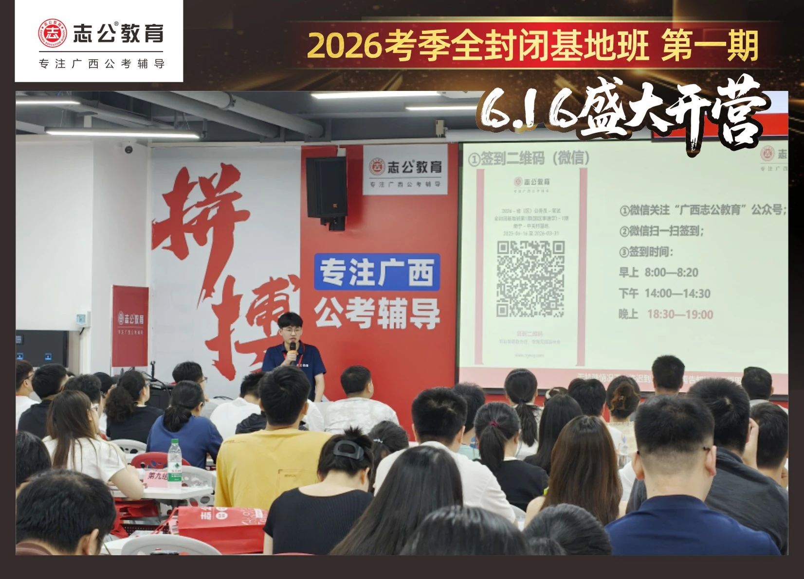 大家稍作休息之后,就是咱們期待已久的開(kāi)班典禮啦!學(xué)員們?cè)诎嘀魅蔚囊龑?dǎo)下分組就坐。大家目光灼灼,熱情高漲,迫不及待想要開(kāi)啟學(xué)習(xí)模式??催@座無(wú)虛席的盛況,志公26考季全封閉基地班第1期課程實(shí)力名不虛傳,各位學(xué)員用飽滿(mǎn)的熱情和積極的態(tài)度迎接此次課程的開(kāi)展,期待大家能夠完成自己的蛻變和成長(zhǎng)!