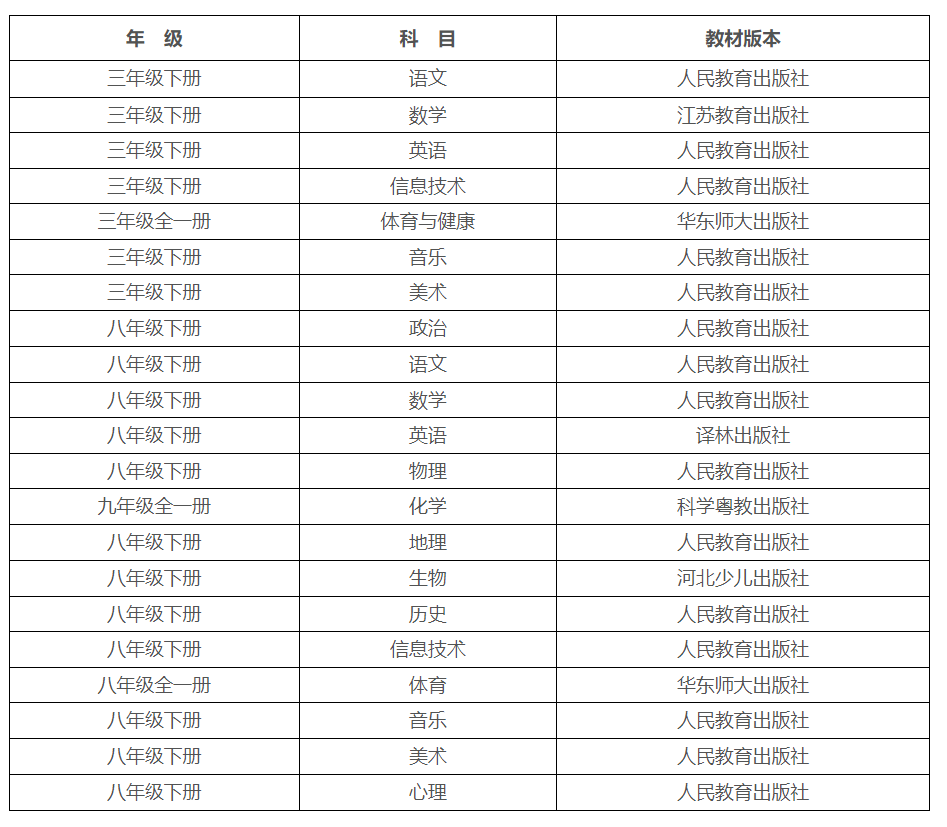 欽北區(qū)2025年春季學(xué)期使用的教材內(nèi)容,小學(xué)三年級(jí)、初中八年級(jí)(化學(xué)九年級(jí))。教材版本如下: