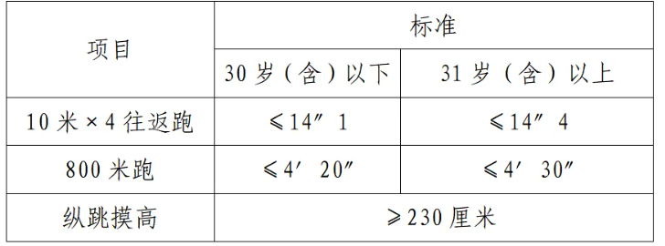 體能測(cè)評(píng)項(xiàng)目中,縱跳摸高的測(cè)試次數(shù)不超過3次,10米×4往返跑測(cè)評(píng)次數(shù)為2次,1000米/800米的測(cè)評(píng)次數(shù)均為1次。應(yīng)聘勤務(wù)崗位的人員,體能測(cè)評(píng)三項(xiàng)全部達(dá)標(biāo)的方為合格;應(yīng)聘文職崗位的人員,體能測(cè)評(píng)三項(xiàng)有兩項(xiàng)達(dá)標(biāo)的,視為合格。