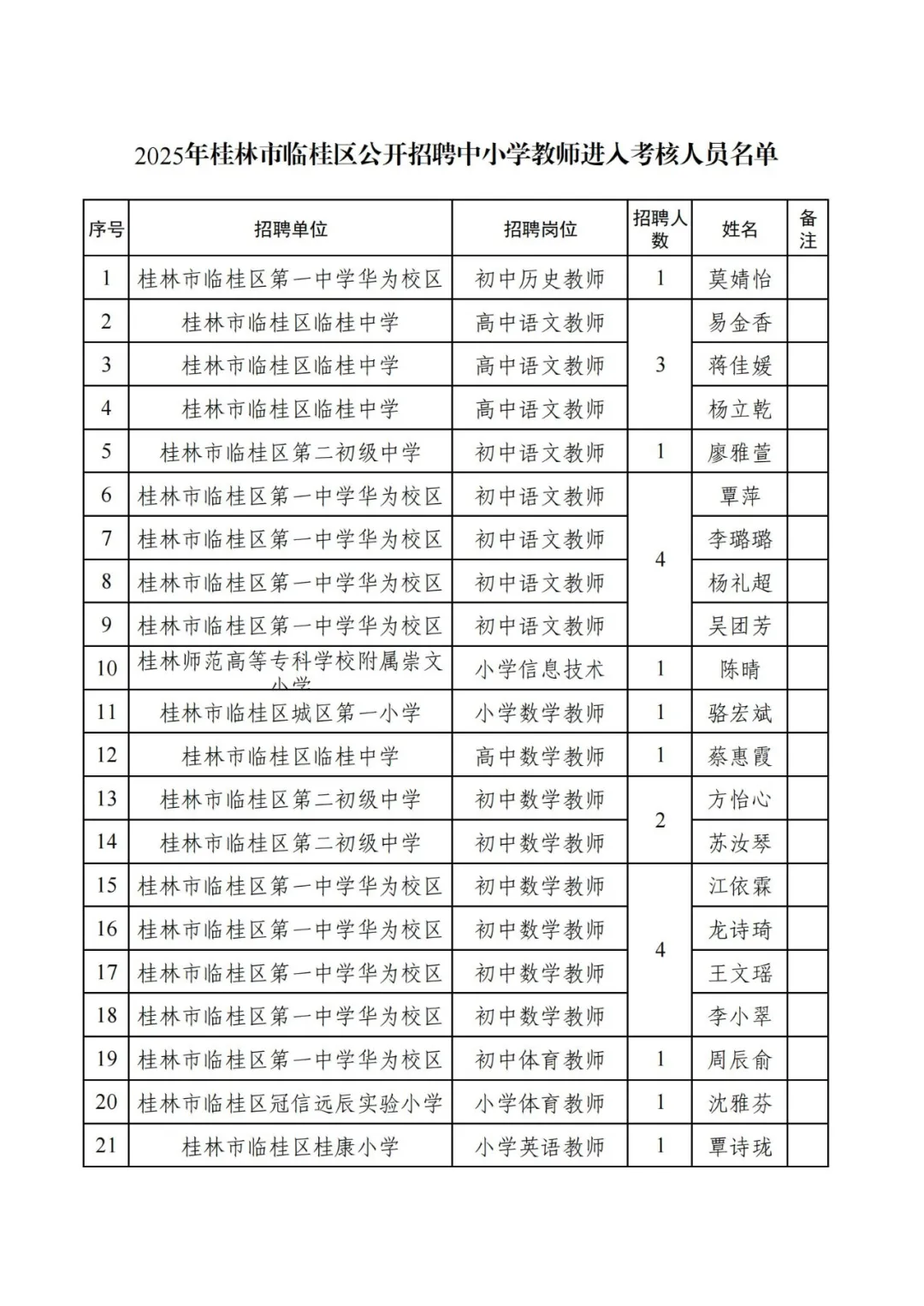 附件:2025年桂林市臨桂區(qū)公開招聘中小學(xué)教師進(jìn)入考核人員名單