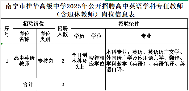 2025年南寧市桂華高級(jí)中學(xué)公開招聘2名高中英語(yǔ)專任教師(含退休教師)的公告
