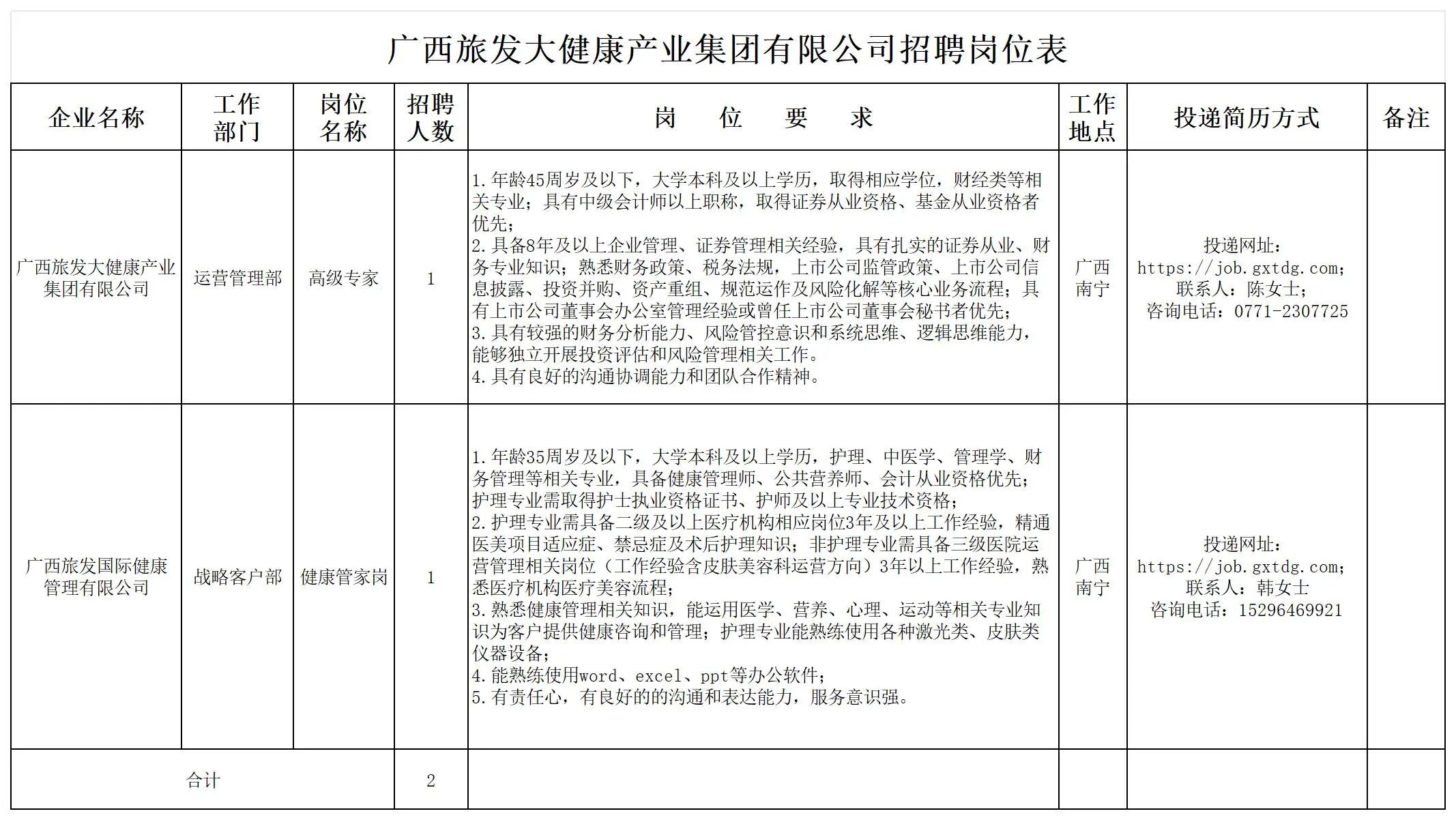 廣西旅發(fā)大健康產(chǎn)業(yè)集團(tuán)有限公司有關(guān)崗位員工2名(詳見招聘崗位表)。