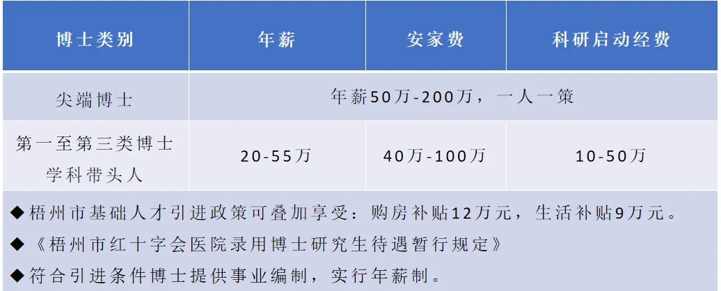 博士研究生學(xué)歷學(xué)位的急需緊缺專業(yè)人才:享受醫(yī)院引進(jìn)博士待遇20-200萬(wàn)元/年,實(shí)行年薪制待遇一人一議,提供科研啟動(dòng)經(jīng)費(fèi)10萬(wàn)-50萬(wàn)元,疊加享受梧州市人才引進(jìn)補(bǔ)助,安家費(fèi)52-125萬(wàn)元,生活補(bǔ)貼9-12萬(wàn)元。