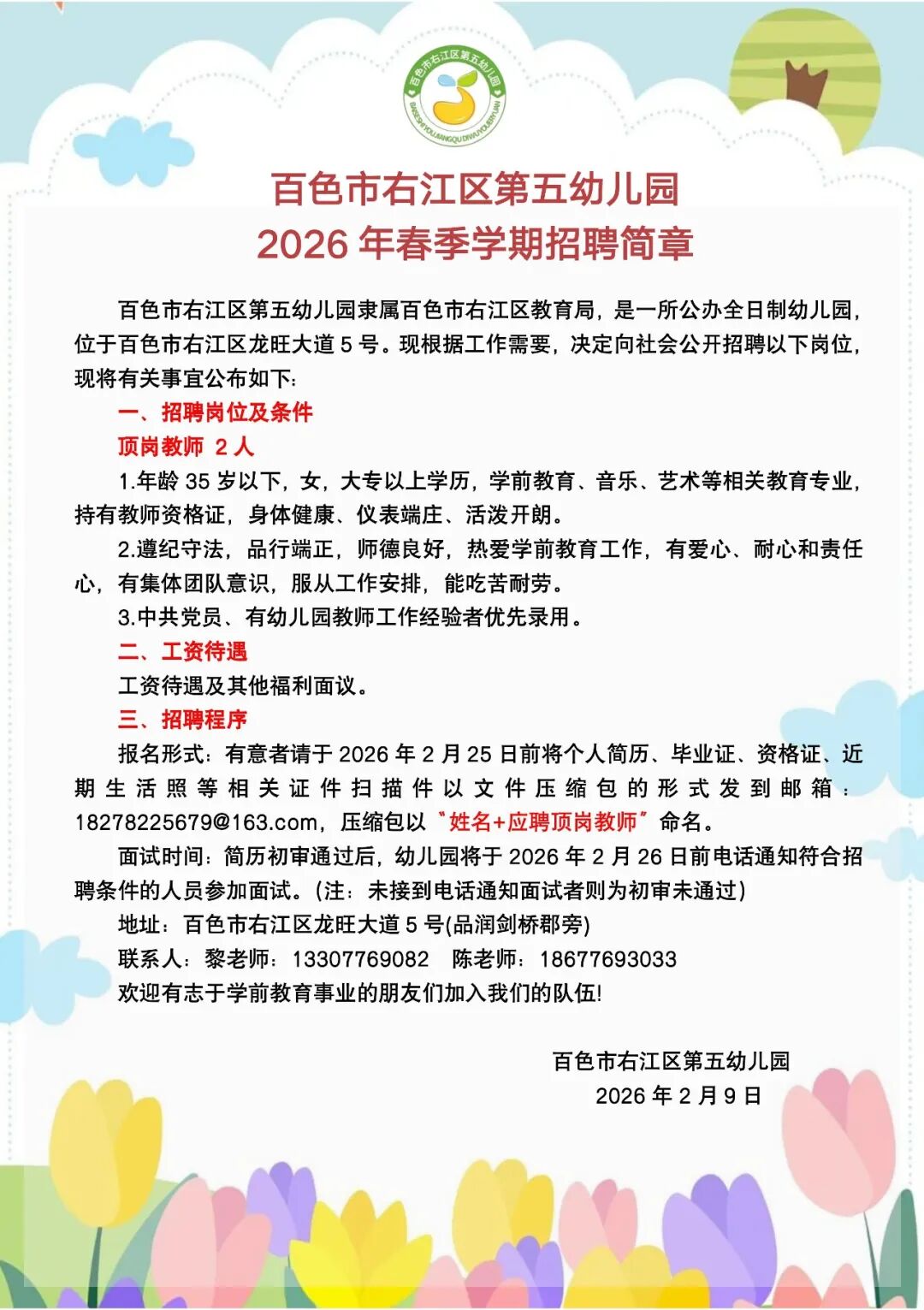 2026年春季學期百色市右江區(qū)第五幼兒園招聘2人